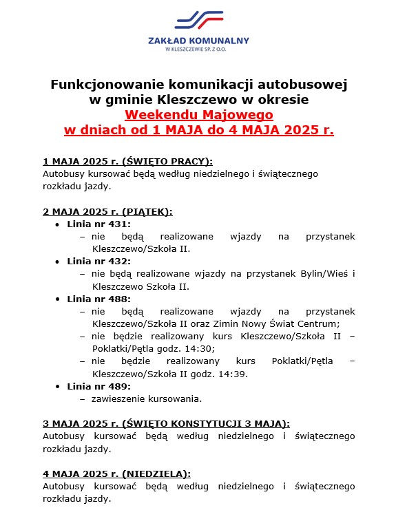 Funkcjonowanie komunikacji autobusowej w gminie Kleszczewo w Weekend Majowy