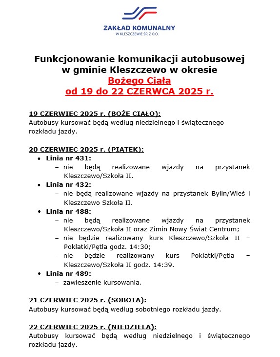 Funkcjonowanie komunikacji publicznej w okresie Bożego Ciała od 19 do 22 czerwca 2025 r.