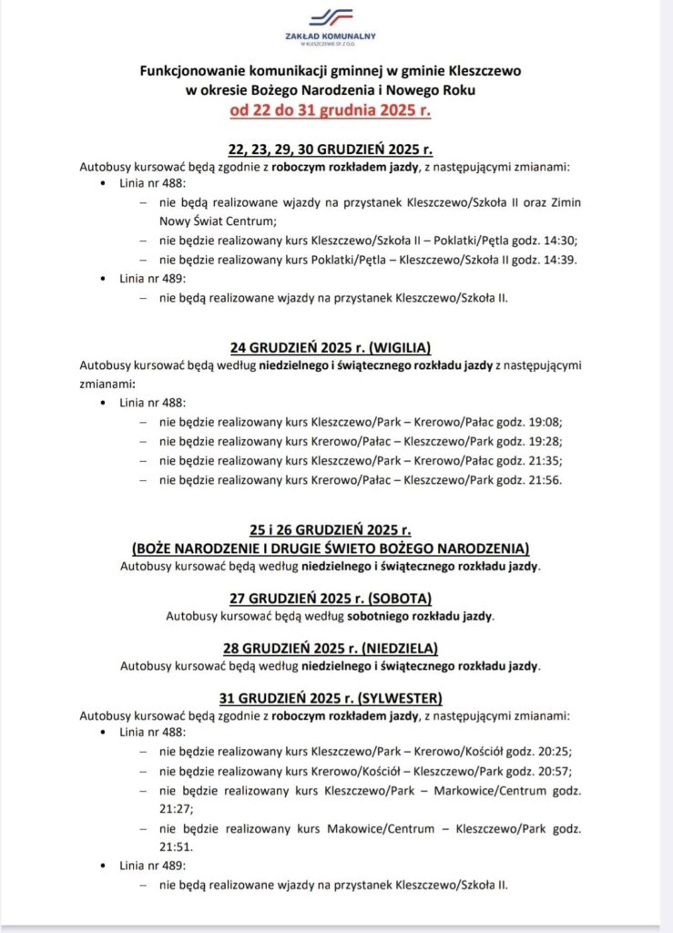 Plan Funkcjonowania komunikacji w Gminie Kleszczewo w okresie świątecznym