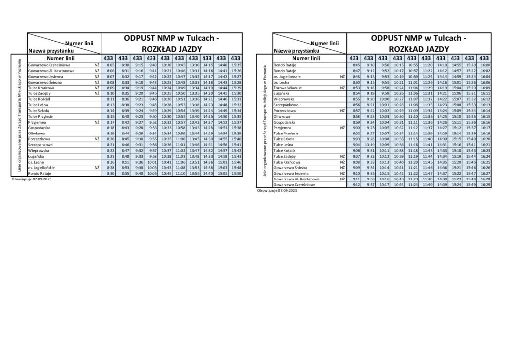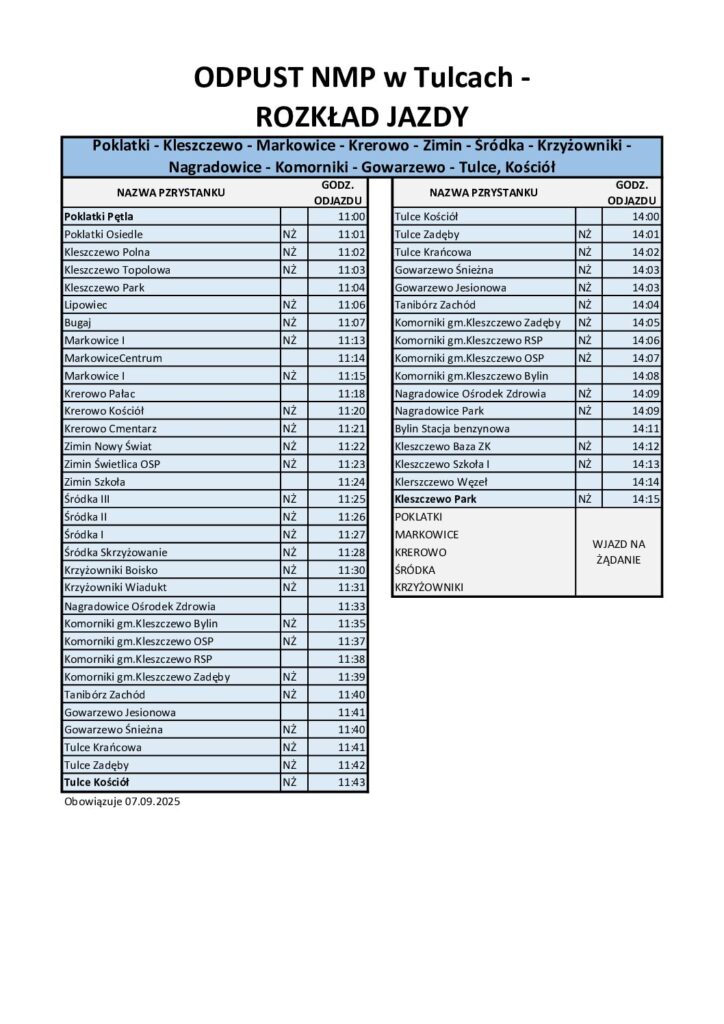 Wzmocnienie transportu publicznego w dniu 07.09.2022 r. z uwagi na obchody Wielkiego Odpustu Narodzenia NMP w Tulcach.