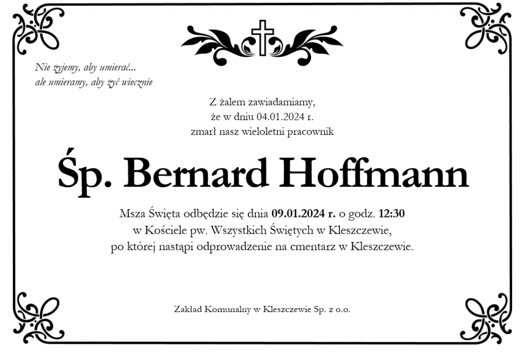 Z żalem informujemy, że w dniu 04.01.2024 r. zmarł nasz wieloletni pracownik